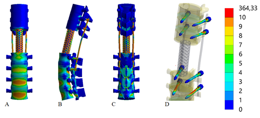 In summary, the addition of cross-links, regardless of the screw length, generally improves stress distribution and reduces peak stress values across the spine model. Long screws with cross-links present the most favorable outcomes in terms of stress management, suggesting their efficacy in clinical settings where spinal stability and reduced risk of mechanical failure are crucial.