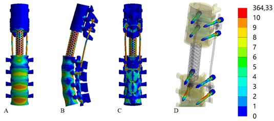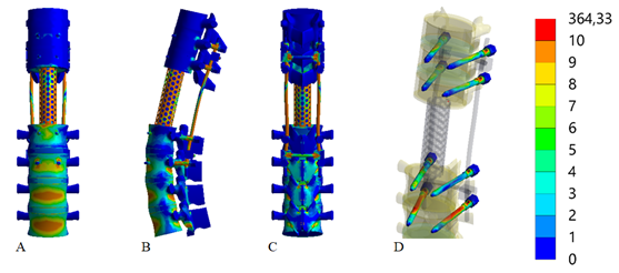 The initial phase of the study focused on analyzing the stress-strain state of the thoracolumbar spine segment model after the resection of vertebrae Th12 to L5 when using transpedicular fixation with short screws without transverse cross-links. The stress distribution within the model is presented in Figure 2.