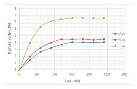 The adsorption moisture test procedure is described by NF EN ISO 483: 2006-01 standard. It was carried out in science du sol laboratory of the Faculty of Agronomic and Agricultural Sciences (FASA) of Dschang University. The saturated salt solutions were prepared with distilled water 24 hours before the beginning of the test at 23±1°C. The NFC were dried to 105°C for 48 hours and introduced into a desiccator to avoid reabsorption of ambient moisture. For each environmental condition three specimens were introduced in small enclosure as presented in Figure 3. Periodic gravimetric measurements were achieved until the saturation period was reached in order to observe the kinetic adsorption of moisture on the specimens.