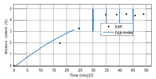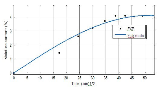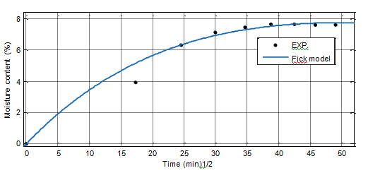 The Fick curve expresses the moisture content versus the square root of time. The first phase of that curve is linear and the second phase is curvilinear. The diffusion coefficient D expresses the speed to which the process of the diffusion takes place. It is the diffusion speed of substance per unit of section divided by the gradient of concentration in that section. The statistical analysis of experimental data have been done in the Matlab 2014a software environment which enabled drawing experimental curves. The Fick model will fit well the experimental data if it has an average correlation coefficient near to the unit, the square root of mean error average near zero, and the sum of square error average near zero.