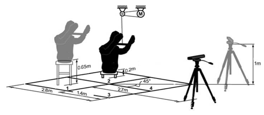 Figure 1 Experimental set-up of the multi-factor analysis. The mannequin is placed in four different positions (numbered 1 - 4) and two different heights (0.20m, 0.65m) with the Kinects in two different orientations (front, 45º). The wrists are fixed at a certain distance and moved upwards by an external motor, out of the field of view, at two different speeds. Dimensions are not in scale.