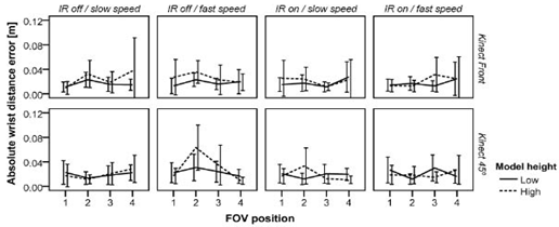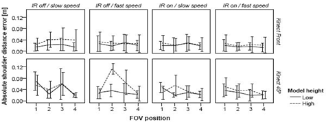 The grand mean for the shoulder distance error is 0.018m and 0.013m for the wrist distance error. Multivariate test show that all main factors, except for computer CPU, and the majority of interactions are significant between the dependent variables, were Kinect position shows the largest effect size (0.30). Figure 3 & 4 show a collection of the mean absolute error and their standard deviations for the shoulders and wrist, respectively.