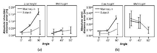 A full factorial MANOVA test on the log-transformed data shows that all observed differences for both shoulder and wrist distance errors are of significant order (p < 0.001). The grand mean for the shoulder distance error is 0.027m and 0.098m for the wrist distance error. In general, the mannequin showed higher levels of error compared to the human subjects with an effect size reaching 0.3. Further effect sizes indicate that the shoulder distance error is most influenced by orientation angle (0.387), whereas wrist distance error is most influenced by height (0.392) and its interaction with orientation angle (0.457).