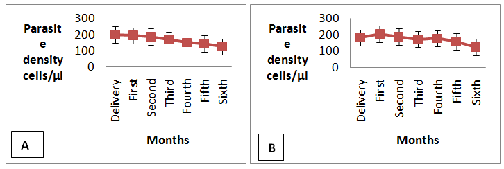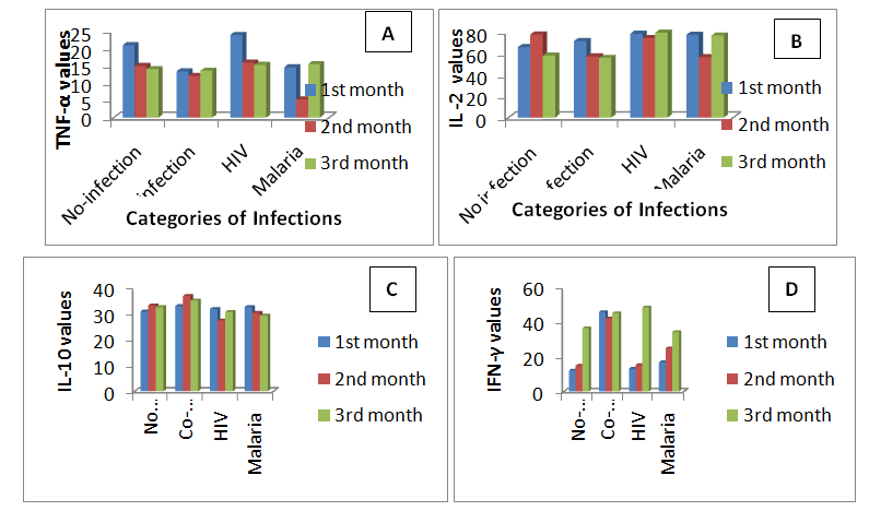Saki; (Latitudes 8o 26' and 9o 5' North and Longitudes 2o 45' and 3o 37' East) known for its seroprevalence and co-infection in Oyo State, Nigeria. 149 pregnant mothers screened of HIV and P. falciparum after due informed consent and ethical approval by UI/UCH Ethical Committee and 30 babies born to sero-positive mothers were enrolled and followed-up post-partum. Blood samples (5mL) collected were screened for the presence of malaria parasites. Patients’ CD4+ counts and plasma concentration of (TNF-α, IL-2, IL-10 and IFN-γ) were determined by FACS and ELISA techniques respectively Data obtained were analyzed using Student t-test and ANOVA.