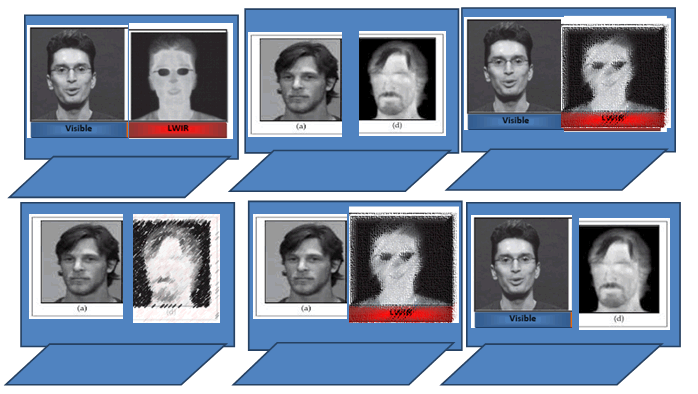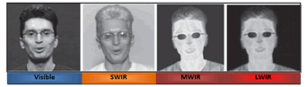 Figure 1 A set of multiple spectral pictures e.g. from Google Cloud Storage, or directly multiple spectral image data bases (DARPA (AFOSR) Human Identification at Distance (HID) 2002-2003collected at National Institute of Standard Technology over 100K faces of 300 people known as the Equinox Corporation Visible/Infrared Face Database(http://www.equinoxsensors.com/hid)with 6 month apart for tracking any aging and emotion effect; For Infrared Faces are peaked Planck blackbody radiation spectrum at 〖37〗^o C which is maximum around 9 μm the center of LWIR ).