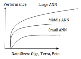 - Nonlinear Phase Transition of the Performance versus training data sizes (giga, terra, peta bytes). A typical small ANN is 50x50x5layers: medium ANN is: 500x500x10layers, large ANN is: 1000x1000x100layers. While the assertion is taken from Andrew Ng, Baidu, 2016 You Tube, the explanation is given in our paper. The reason behind may be understood in twofold details: The performance is plotted in (b) along y axis against the training data size along x-axis, over two saturation curves in parameter of the sizes of neural networks (1) small, (2) medium and (3) large. Both (1) (2) are saturated, except (3) large keep going the performance. We know this reason of indefinite performance is due to quadratic law of interconnect matrix [W_(i,j)] for 3 neurons is 3x3 =9 and n neurons is nxn=n^2 growth. Also, the layer of neural network can also increase to enhance the performance by more gross level features sets are incorporated as more layers are met with lower & lower dynamic range pixels, since both [W_(i,j)]& sigmoid logic are usually less than one as a low resolution/pass filter.