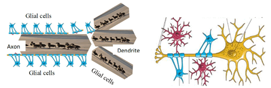 Figure 8 Functionality: They surround each neuron Axon output, in order to keep the slow neural transmit ions line up inside the Axon tube, so that one pushes in the other pushes out in real time. There are more functionality provides nutrients. Neuroglial Biology insures 4 functionalities: