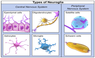 There are 6 kinds Glial cells (about one tenth in the size compared with Neurons; 4 kinds in CNS(Astrocytes, Microglia, Ependymal, Oligodendrocytes Myelin Sheath); two in Spinal Core: (Satellite, Schwann). (Figure 8) They are more than silent partners as housekeeping servant cells (Figure 9)(Table 1).