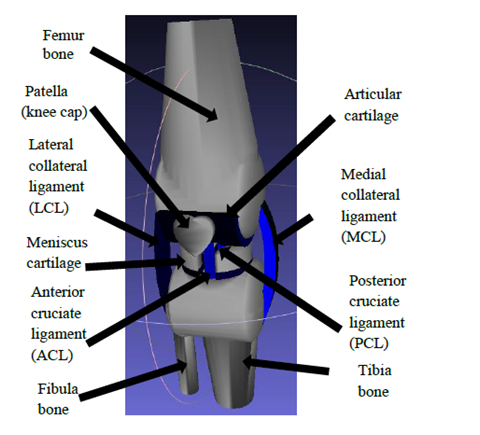 In this model bones (femur, tibia fibula and patella), collateral ligaments (LCL and MCL), cruciate ligament (ACL and PCL) and articular cartilages are included. Figures 1 briefly explains the anatomy the knee joint model what it looks like from the inside.