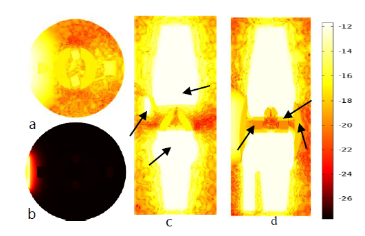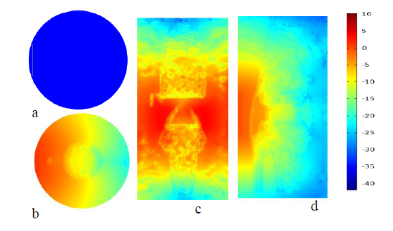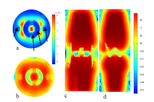Figure 9 Plot (a) and (b) are temperature distribution of normal knee joint for both real valued and log scale at the transverse plane respectively. Whereas plot(c)and(d)are temperature distribution at frontal and sagittal plane using Monte Carlo algorithm.