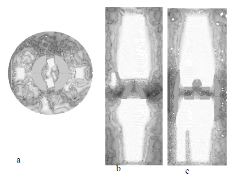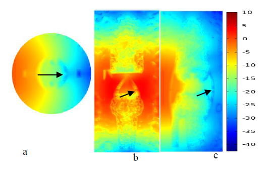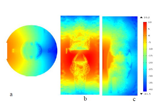 Figure 7 Plot (a), (b) and plot (c) are natural-log scale temperature distributions at transverse, frontal and sagittal planes in thermal light map.