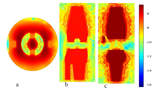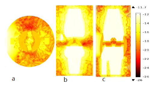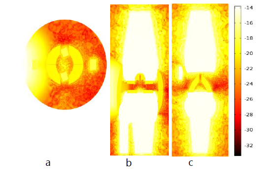 Figure 10 Plot (a), (b) and plot (c) are natural log scale temperature distributions of OA knee joint generated using Monte Carlo results at transverse, frontal and sagittal planes.