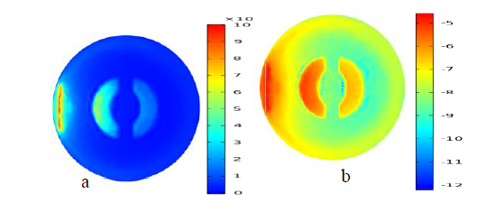 For Monte Carlo results for real fluence distribution images only the transvers plane slice was included in the report for comparison with diffusion approximation results. Since it is demonstrated that temperature plots show better resolved and contrasted image fluence images for other two planes not included. Figure 8 shows Fluence distribution at both real valued (a) and natural logarithmic scale(b) plots for normal knee joint at transverse plane. In this image we see a better image constructed using real value Figure 8a compared to diffusion approximation resulted image Figure 2a, however ligaments are not resolved well.