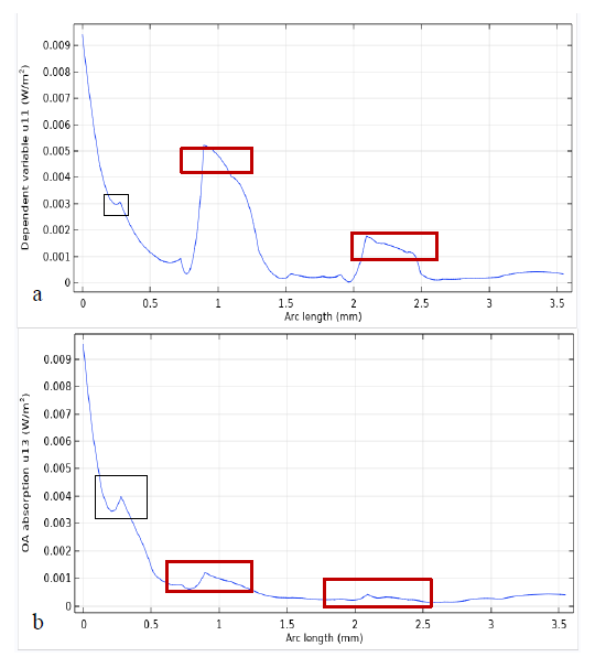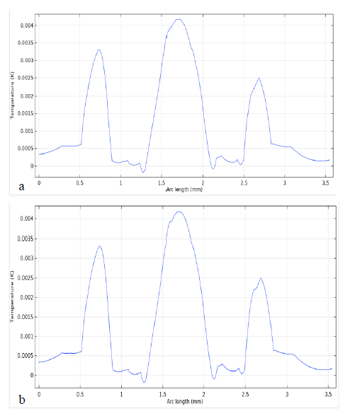 Figures 9-13 shows that temperature plot for normal, OA and injured knee respectively as diffusion approximation. graphs in Figures 11&12 shows that the fluence distribution and temperature distribution through the line for normal (a) and OA (b) knee joint respectively. The arc line starts from the source and moves towards the inside until the end of the knee, and it passes through the collateral ligaments and the meniscus in the same direction as light propagation. This graph demonstrates both attenuation light as it goes deeper and deeper and the absorption differences in the meniscus and collateral ligaments. In OA joints collateral ligaments have higher absorption relative to normal collateral ligaments (traced by black square), however OA meniscus (traced in red rectangle) have lower absorption than normal one. In addition, temperature plots show better resolution between joints, however it is less effective than fluence distribution to detect differences in OA and normal joints, this is due to the fact that thermal and mechanical properties used for the simulation were the same as the normal due to inaccessibility of data for OA joint. we knew that in real case the thermal and physical properties (density, perfusion rate other thermal properties) are not the same so that temperature could improve results and show the difference between normal and OA knee joint.c