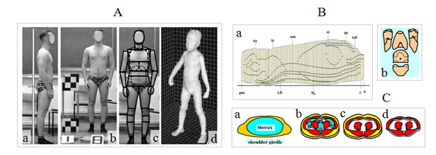 Figure 1 Examples of illustrations from the article in Acta Physica PolonicaA [24]: A – different techniques of obtaining external geometrical dimensions of the body (a – anthropometer, b – photogrammetry, c – modeling, d – laser use, courtesy of Hamamatsu ); application of computerized tomography (B) for obtaining internal images of layers of the body (a) for trunk parts (b); and their tissues (C) (a – division of a layer onto trunk parts, b – whole layer including bone and digestion tissues, c – muscle and adipose tissues, d – muscle tissue).