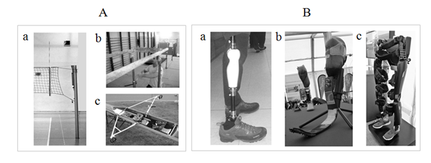 Figure 2 Examples of illustrations from the chapter of the monograph A Closer Look at Biomechanics [25]: A – adaptation of devices of sport engineering for dimensions of the athlete’s body: a – volleyball, b – gymnastics, c – rowing; B – devices of orthopaedic engineering which need to be adjusted to the dimensions of patient’s body: a – lower leg prosthesis, b – flex-foot, c – exoskeleton.