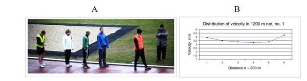 Figure 3 Research activities at the stadium of distribution of velocity at a distance of 1200 m: A – students waiting for the start command at every 20 s; B – a diagram with gathering time at every 200 m (times were obtained with the video camera). Students had heart beat sensor in order to check their involvment into the run. It was found the involvment was high.27