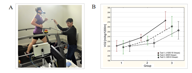 Figure 4 Laboratory investigations of distribution of velocity at a distance of 1200 m: A – a subject runs on a treadmill; B – diagram of oxygen consumption by three groups; better at left), medium, worse (at right) when they ran with different distribution of velocity with the same average value of velocity.28