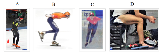 Figure 5 Biomechanical research of speed skating: A – slim body of a competitor, B and C – leaned body gives smaller frontal area, D – enormously enlarged quadriceps femoris muscle (athlete after the run).29