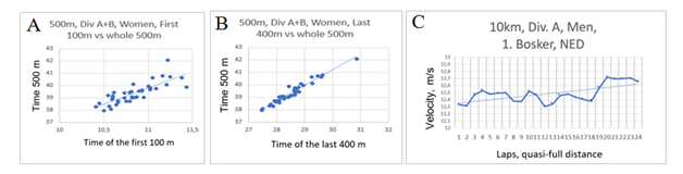 Figure 6 Investigations of distribution of velocity in speed skating: A – after the first 100 m it is hard to say who will be the winner in 500 m distance; B – further fragment shows strong correlation of time with the end time; C – the male winner at 10 km had rising velocity profile along the distance (this is in accordance with the Erdmann’s law on distribution of load); quasi-full = without the first 400 m.30