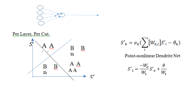 Figure 5 Artificial Neural Networks (ANN) needs supervised learning in multiple layers known as “Deep Learning”8,9 (a) Left panel shows that while a single layer of Artificial Neural Network can simply be a linear classifier, the right panel shows the dendrite net giving rise to the linear classifier equation after the sigmoid threshold.