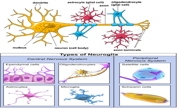 Figure 6 Glial cells: (a) functionality of neuroglial; (b) There are 4 kinds in the Central Nervous System, and 2 kinds in Peripheral Nervous Systems.