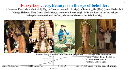 UC Berkeley Prof. Lotfi Zadeh passed away at the age of 95 years old and Walter Freeman at age 89. To them, 80 may be “young.” Likewise, the “beauty” is in the eye of beholder. According to the Greek mythology of Helen of Troy, has sunk thousand ships, and Egypt Cleopatra hundred ships and Bible Eva one ship (Noah Arc) (Figure 8). Boolean logic is sharp, not fuzzy. Unfortunately, the shortened “Fuzzy (membership function) Logic” as “Fuzzy Logic” is a misnomer. Logic cannot be fuzzy, but the set can be open set as all possibilities. Szu et. al. have advocated a bifurcation of chaos (advocated first by Walter Freeman in human brains with Bob Kozma) as a learnable FMF, making the deterministic Chaos as the learnable dynamics of FMF (cf. Max Planck: ResearcGate.net). Consequently, the car will drive through slowly when the red light happens at the mid night in desert and without incoming cars. Such an RB becomes flexible as EBES. To show that this replacing RB with EBES is a natural improvement of AI in the remaining paper. This explains a driverless car that will turn the rule stopping at red light to be gliding over the red light when no incoming car at mid light in desert.