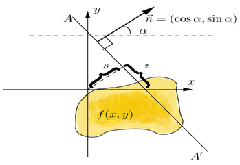 Figure 10 s is the distance of L from the origin and α is the angle the normal vector to L makes with the x-axis).Let f be a function that represents an unknown density, then the Radon transform represents the projection data obtained as the output of a tomographic scan.