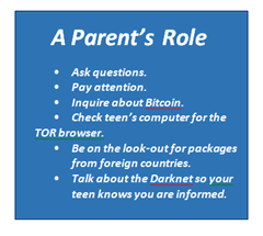 Have you heard of the Darknet? Do you know what cryptocurrency is? Have you ever heard of TOR? These are very compelling reasons for parents to learn and embrace new technology.5 If you do not understand it, you may not be able to stop it. These three things are the gateway to the digital black market for drugs, guns, and many other illegal products and services.6 The Darknet and the digital black market is accessible through a browser referred to as TOR. The Darknet is the non-indexed, secret section of the Deep Web that is primarily, used by those engaged in illegal activities.7 It cannot be accessed through regular browsers. It is a group of websites with onion domains and the Onion Router or Tor browser software is needed to access these sites. This allows for world-wide anonymous web browsing. Once in, there are Google-style search engines and Amazon-style marketplaces selling stolen passports, weapons, hacked account numbers, and drugs lots and lots of drugs. You may have been hearing about the Bitcoin rage.8 But what you need to realize is that bitcoin is a cryptocurrency.9 Cryptocurrencies are not traceable, and were developed to protect anonymity.10 Why? So the new wave of black market dealers can sell their products and services online, without being traced.11While the Darknet is full of all kinds of illicit activities, our teens are using it to buy drugs.12,13