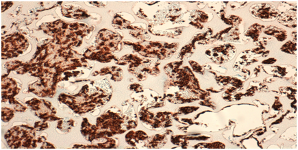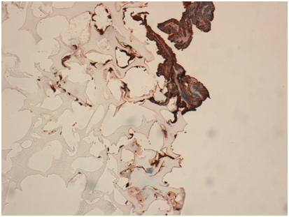 Our team work has obtained very good results from adopting this novel approach in the context of ROSE. The immuno-phenotype of two lymphoid lesions (Figure 3) and the hormonal target of ten breast cancer cells on adsorbed cells on FOAM was determined, with results consistent with those obtained from micro-histological biopsy by tru-cut, performed in second instance to verify the reliability of the new device. Cytofoam-core was also used for immune phenotypic evaluation of ten suspected thyroid lesions on which it was possible to detect the point mutation B-RAF V600E, with full histologic correlation in each of the investigated cases (Figure 4).