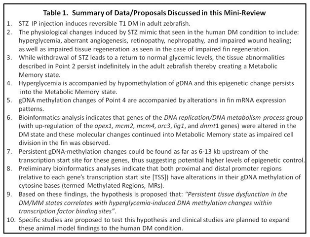 Metabolic memory (MM) is the persistence of diabetic (DM) complications even after glycemic-control is pharmacologically achieved. Using a zebrafish diabetic model that induces a MM state, we previously reported that in this model, tissue dysfunction was of a heritable nature based on cell proliferation studies in limb tissue and this correlated with epigenetic gDNA-methylation changes that paralleled alterations in gene expression. Bioinformatics analysis found that gene expression of the DNA replication/DNA metabolism process group was altered in the DM state and altered expression continued into MM state. In this mini-review, we propose that the underlying mechanism(s) that explain how these gene expression changes relate to the long term complications observed in diabetes stems from alterations in the ability of transcription factors to bind to their respective gDNA binding sites. gDNA methylation changes of promoter regions (both proximal and distal to the transcription start site) would disrupt the ability of transcription factors to bind to their gDNA binding sites and this would be tissue specific; thus explaining the variety of problems observed patients suffering from the long term complications of diabetes mellitus (e.g. problems associated with the kidney, retina, skin wound healing processes, and angiogenesis, etc.). Clinical studies are now in planning for the translation of these findings to human DM.