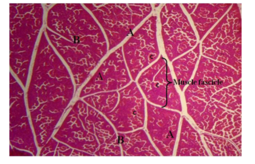Figure 4 Photomicrograph of triceps brachii of adult Red Sokoto goat’s triceps brachii. Showing: A, Perimysial spaces; B, Muscle fascicles; C, muscle fibres (H&E, magnification x400).11