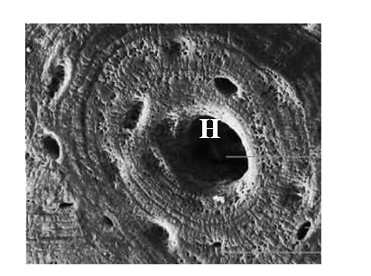 Figure 13 A photograph of a bone tissue on electron microscope, showing the harversian canal (H) and Lacuna (L).37
