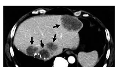 Figure 23 CT scan of the upper abdomen showing multiple metastasis in the liver of a patient with carcinoma of the large bowel (black arrow).59