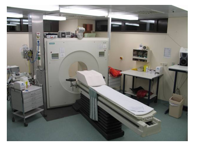 A CT scan is a type of radiography that also uses X-ray, unlike the Projectional radiography the CT scan uses a higher amount of X-rays and it provides a more detailed 3D image, however in recent years, some CT scans has been developed to use a smaller amount of X-ray. The CT machine comprises of a doughnut shaped CT scanner, table, X-ray tube, X-ray detector and computer (Figure 21).54,55 The patient lie on the table before sliding into the CT scanner, the X-ray tube and camera moves round the patient at 360° to scan and produce multiple image of the internal organs of the body, depending on the organ of interest a contrast material might be administered either through the mouth, rectum or injected into the vein to highlight the scanned organ.55 The scan is performed in a separate computer room where the images are displayed and the technologist communicates with the patient with the aid of speakers and microphones.56 The major advantage of CT scan is rapid acquisition of clearer diagnostic images of a wider proportion of the body.56,57