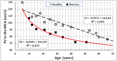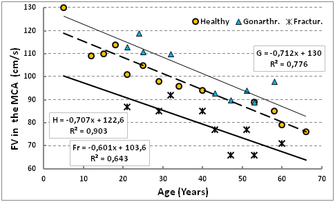 Literature data on age-related decline in FV in the MCA were mostly obtained during examination of healthy people and patients with arterial hypertension,3,12 including the children's people2,5 and elderly.4 The reason for the decline of FV researchers was seen in age-related reduction in minute volume of the heart,13 the reduced metabolism of the nervous centres and the sensitivity of chemoreceptors to carbon dioxide.5,7 In our study confirmed that with increasing age of FV to MCA really reduced in healthy humans, and orthopedic pathology. However, it is shown that the constant component of the regression equation above the norm in diseases of the joints and below the surgical treatment by Ilizarov diseases of the limbs and bone fractures. Existing hypotheses of decline do not allow to explain the nature of such differences.
