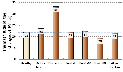 During this period, the treatment of patients scope changes FV in MCA in the implementation of samples with the muscles of the wrist grab was increased in comparison with the quantities of changes of healthy people, In the process of the distraction scale was increased to 33%. By the end of the distraction indicator of the scope has stabilized at 22%±1.6 (Figure 7), characteristic for healthy people.