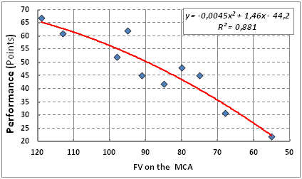 Figure 1 The dependence of the capacity of patients with gonarthrosis of the value of FV in the MCA.