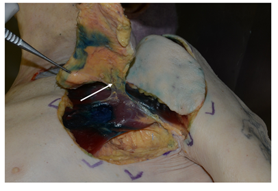 Prior to our work, all the institutional procedures concerning cadaverous dissection were respected, as well as the ethical framework. Dissection was performed in 24 anatomical regions from 12 non-formalin fixed cadavers. The mean age was 69 years (range 47–88); there were 9 males and 3 females. The cadavers had no history of surgery or deformity in the areas targeted for dissection (supraclavicular, pectoral and deltoid regions). They were embalmed using a glycerin-rich, formalin-free solution to preserve tissue suppleness. The solution used for embalming corpses was called "BIOMET". It is the solution usually used in the anatomy laboratory of the University of Lille (France) for the conservation of cadavers before dissection. The composition for obtaining 13.7 liters of BIOMET is as follows: 4.75 liters of methanol + 4.75 liters of distilled water + 3 liters of glycerin +1.2 liters of phenol.