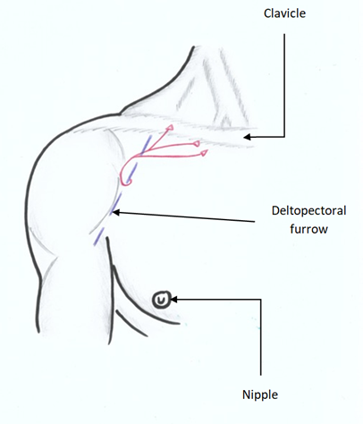 Figure 4 Projection of the origin and path of the clavicular branch (in red) of the thoracoacromial artery.