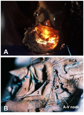 Abbreviations: RCA, right coronary artery; 1, left coronary artery and sinus; 2, non coronary sinus; 3, intervalvular trigone.