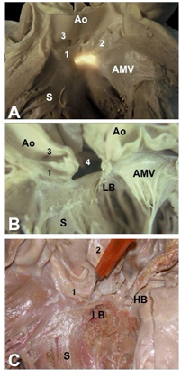 Figure 2 Membranous septum and the stitches. Left view of the mitro-aortic region. (A) Transillumination of the membranous septum showing its relationship with the aortic leaflets and the anterior mitral leaflet (AMV). (B) In this heart the membranous septum was excided (4); note the distance between the left bundle of His (LB) and the so-called aortic annulus. (C) Detail of the relationship between the His bundle (HB) and the non-coronary cusp (2); the pin is located in the membranous septum.