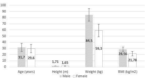 Figure 1 Description of the research participants divided by gender.Legend: m = meters. kg = Kilogram. BMI = Body Mass Index.