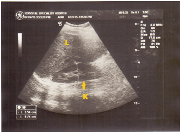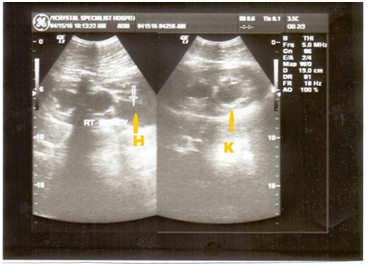 Figure 1 Acute hydronephrosis of the RT kidney (K) with cystic-like corticomedullary differentiation, note isolated dilation of the renal pelvis.