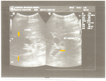 Figure 2 (Ultrasound B-mode split image) RT kidney with possibility of refluxing primary mega-ureter. Progressive renal failure can occur even after treatment due to abnormal physiologic bladder function. Note the arrow pointed downwards.