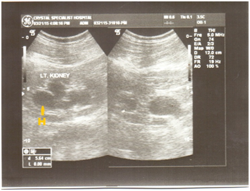 A 40years old man with renal dimensions measuring RK: 118x62mm; LK: 120x65mm respectively reported for ultrasound examination. There was no evidence of malignancy after 8-month follow-up ultrasonography with drug treatment in the internal medical unit; plus urologic evaluation and documentation. Expelled urinary volume via catheter was consistently measured.