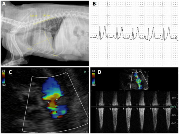 The animal was hospitalized and complementary exams such as, thoracic radiography, electrocardiography, echocardiography, abdominal ultrasonography, hemogram and biochemicals were requested. In the hemogram, no abnormalities were found, whereas in the biochemical, there was a decrease in urea and globulin levels and an increase in creatine kinase. Radiographic examination showed an increase in the cardiac silhouette, with loss of definition of the cardiac apex, globose heart, pleural effusion and generalized cardiomegaly (Figure 1A). Abdominal ultrasonography revealed free fluid and thick floating septations with hyper refrigerant echoes. The electrocardiographic examination excluded the presence of arrhythmias and demonstrated findings consistent with atrioventricular overload and myocardial hypoxia (Figure 1B).