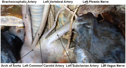 Keywords: thoracic cavity, donated, embalmed, arch of aorta, brachiocephalic trunk, left common carotid artery, left vertebral artery, left subclavian artery, variations, diagnostic & surgical procedures, clinicians, surgeons
