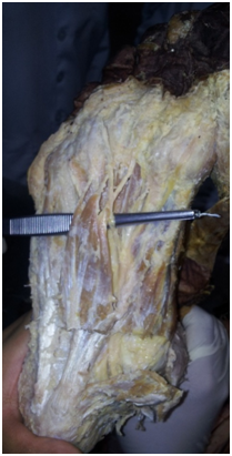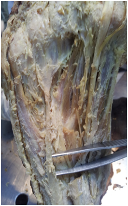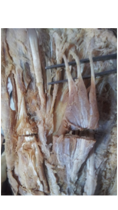 Flexor Hallucis Longus arises from the distal 2/3 of post surface of fibula & adjoining interosseous membrane. FHL tendon grooves the post surface of lower end of tibia, talus and inferior surface of sustentaculum tail of calcanean. FHL tendon reaches to the interval of sesamoid bone under head of first metatarsal then gets inserted at base of distal phalanx. In sole of foot FHL crosses FDL superiorly from lateral to medial side, at the crossing point (knot of Henry, the long digital flexor receives a strong fibrous slip from FHL tendon. The connecting slip to FDL varies in size, it’s usually continues into the tendons for the second & third toes, but sometime restricted to second and occasionally extends to the fourth. In our study all four of left foot toes received digitations from FHL along with FDL (Figure 5).