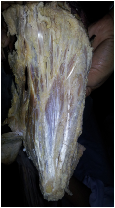 Flexor digitorum braves lies immediately deep to central part of plantar aponeurosis. It arises by a narrow tendon from the medial process of the calcanean tuberosity and intramuscular septa between it and adjacent muscle. It usually divides into 4 tendons for lateral four toes, each slip divide at proximal phalanx and attaches to side of middle phalanx, thus forms tunnel for FDL. In our study we found 3 digitations of FDB, slip to fifth toe was absent (Figure 3) (Figure 4). The slip to given toes may be joined by supernumerary slip or be absent. Nathan and Globe2 found the slip to the fifth toe to be most susceptible for such variation (63%), Bergman et al.,6 Yalcin and Ozan7 and Lobo et al.,7 Ilayperuma I.9 Those to third or fourth less so (10%) that to second almost invariable.